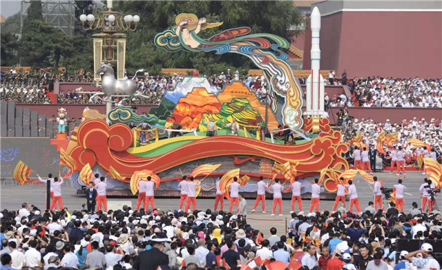 10月1日上午,慶祝中華人民共和國成立70周年大會(huì)在北京天安門廣場隆重舉行。生態(tài)祁連、奔馬乘風(fēng)、今古飛天……一個(gè)個(gè)特色鮮明的甘肅符號(hào)組成的“如意甘肅”大型彩車,藝術(shù)的再現(xiàn)了甘肅絲路文化、敦煌文化、航天文化以及生態(tài)建設(shè)和民族和諧,凝結(jié)著2600萬隴原兒女深深祝福,向祖國展示了甘肅經(jīng)濟(jì)社會(huì)發(fā)展取得的巨大成就,表達(dá)了廣大干部群眾認(rèn)真貫徹落實(shí)習(xí)近平新時(shí)代中國特色社會(huì)主義思想,加快建設(shè)幸福美好新甘肅、開創(chuàng)富民興隴新局面的堅(jiān)定意志和必勝?zèng)Q心!