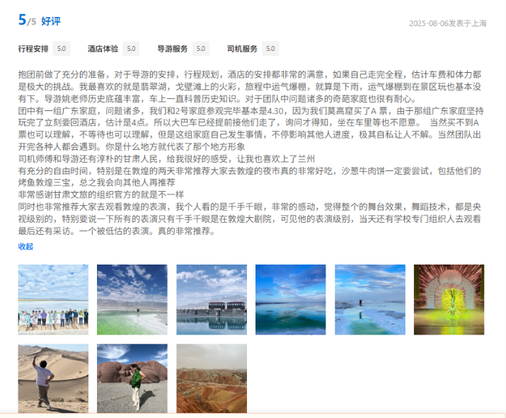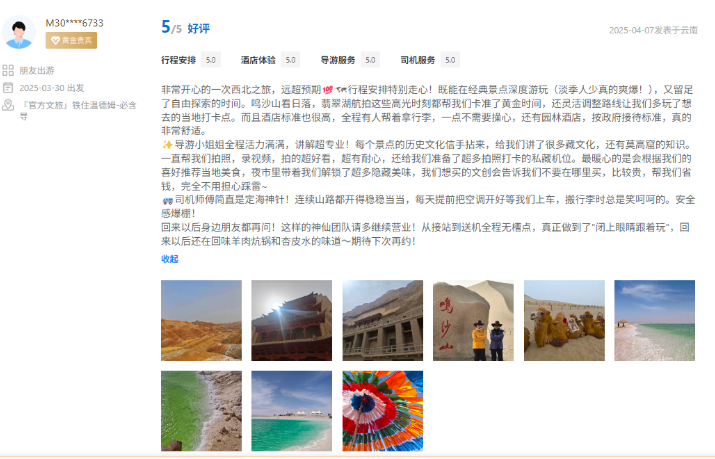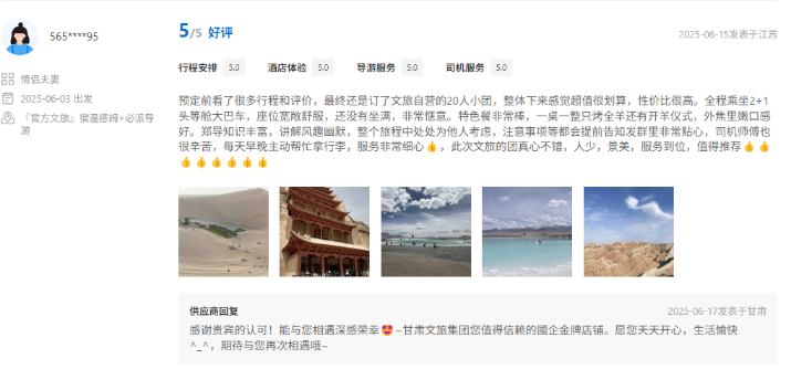 文旅國(guó)旅深度整合甘青兩地的經(jīng)典與小眾旅游資源,精心打造、上線行程豐富、體驗(yàn)舒適產(chǎn)品的同時(shí)南京運(yùn)營(yíng)中心緊密圍繞游客核心需求,協(xié)同配備金牌工作人員隨團(tuán)提供專業(yè)講解與服務(wù),獲得廣泛好評(píng)。平臺(tái)數(shù)據(jù)顯示,近半年以來(lái),其攜程店鋪訂單量同比增長(zhǎng)超過(guò)40%,訂單完成率高達(dá)98.5%,展現(xiàn)出高度的市場(chǎng)認(rèn)可與出色的運(yùn)營(yíng)效能。用戶口碑方面,店鋪好評(píng)率持續(xù)穩(wěn)步提升,目前已達(dá)4.9分,累計(jì)精選好評(píng)超千條,“質(zhì)量可信、服務(wù)可依”的品牌形象日益凸顯。